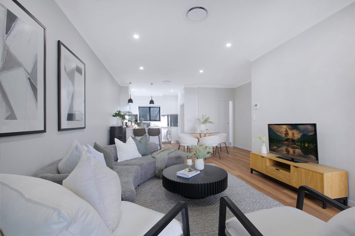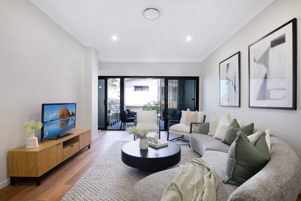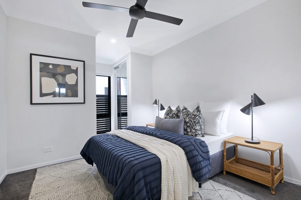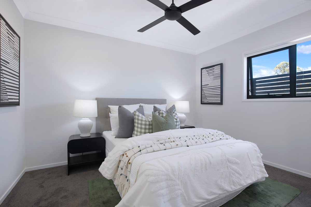 High-end finishes throughout include LED lighting, timber laminate flooring, and striking black ceiling fans in the bedrooms and living areas. Outdoor spaces offer private, low-maintenance landscaped courtyards, providing a peaceful retreat bathed in natural light.