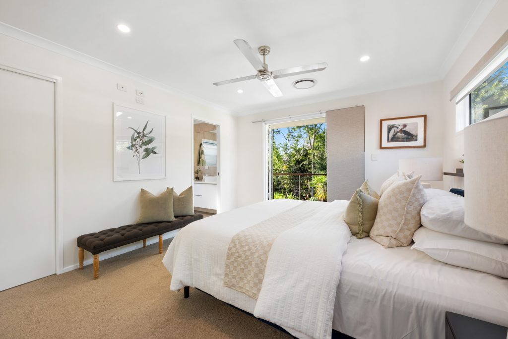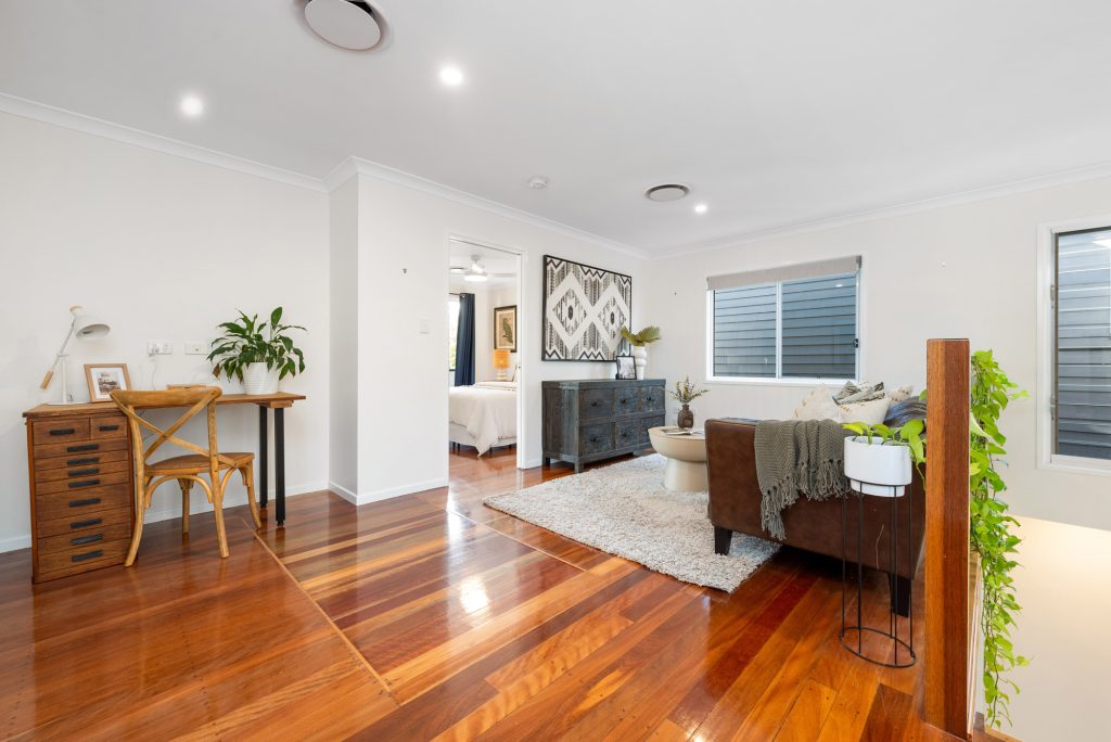 Upstairs the family accommodation is centred around a second living area and includes a North-facing master with a walk-in, ensuite, and pool-view deck, while there’s also essentially a second master at the opposite end with an ensuite and private balcony. Finished with ducted air, timber floors, and an impressive gas kitchen with a walk-in pantry, it’s a home that uses a clever interplay of light and space produces a wonderfully private environment.