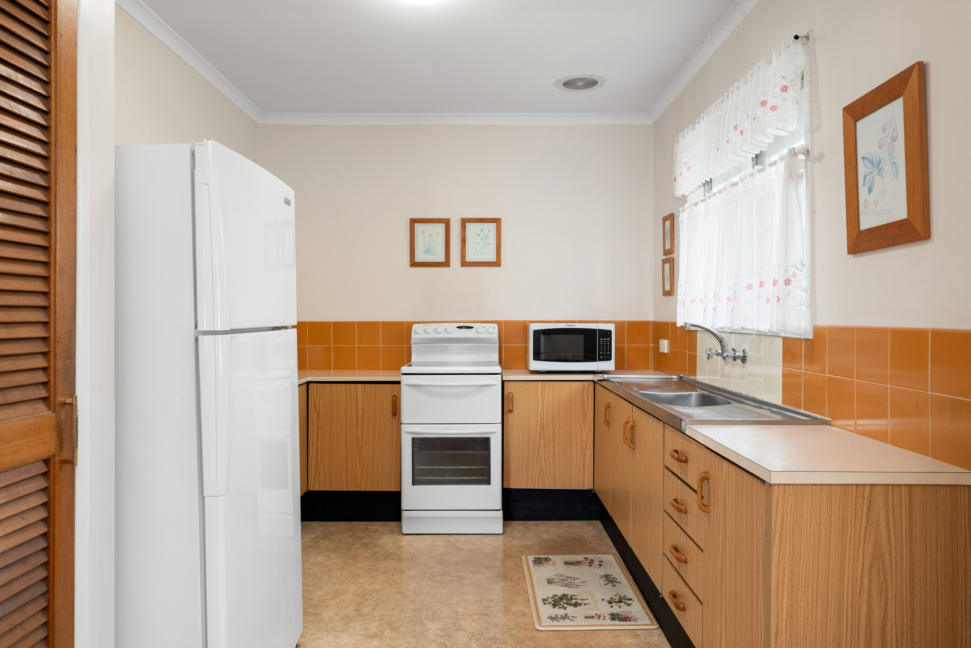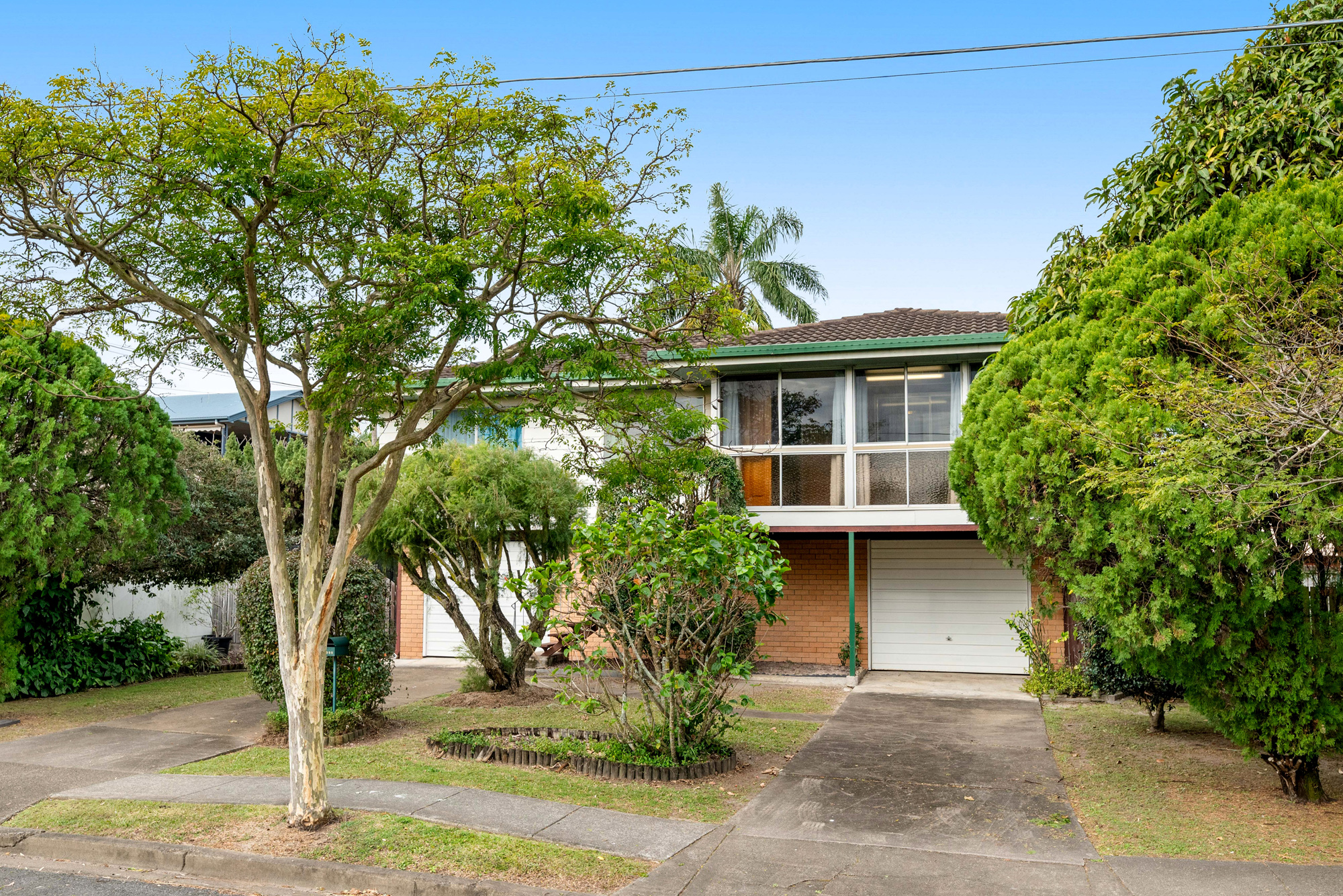 Essentially a blank canvas awaiting your creative vision, it’s set on a sunny 405m2 parcel and offers an easy single level of living, with a double garage and whole floor of storage below. Offering three bedrooms, light-soaked living and dining spaces, a neat kitchen and bathroom, and a huge sun room to the front, it’s got plenty of space to park trailers, tinnies and toys off the street, with all the right bones to be back in vogue whether you’re thinking a cool, mid-century vibe, modern pad, or a light refresh with low-cost cosmetic upgrades.