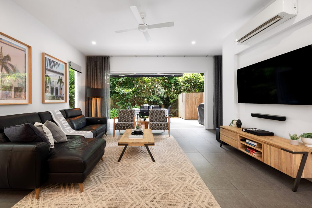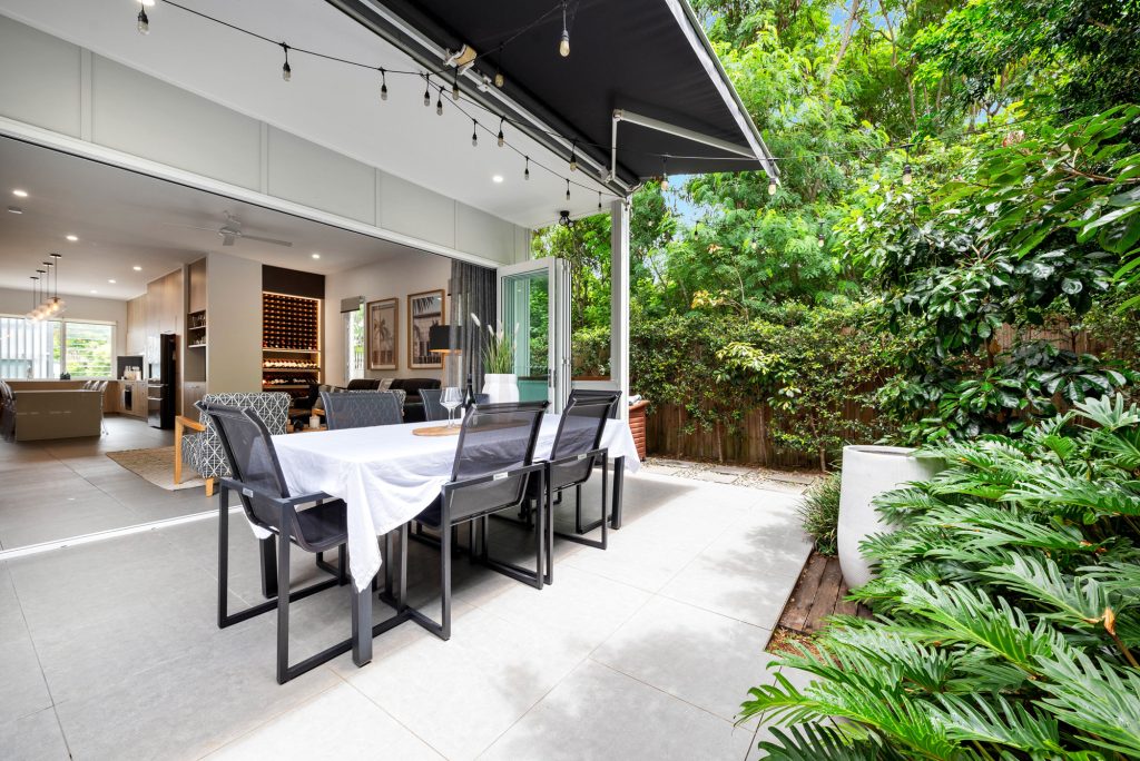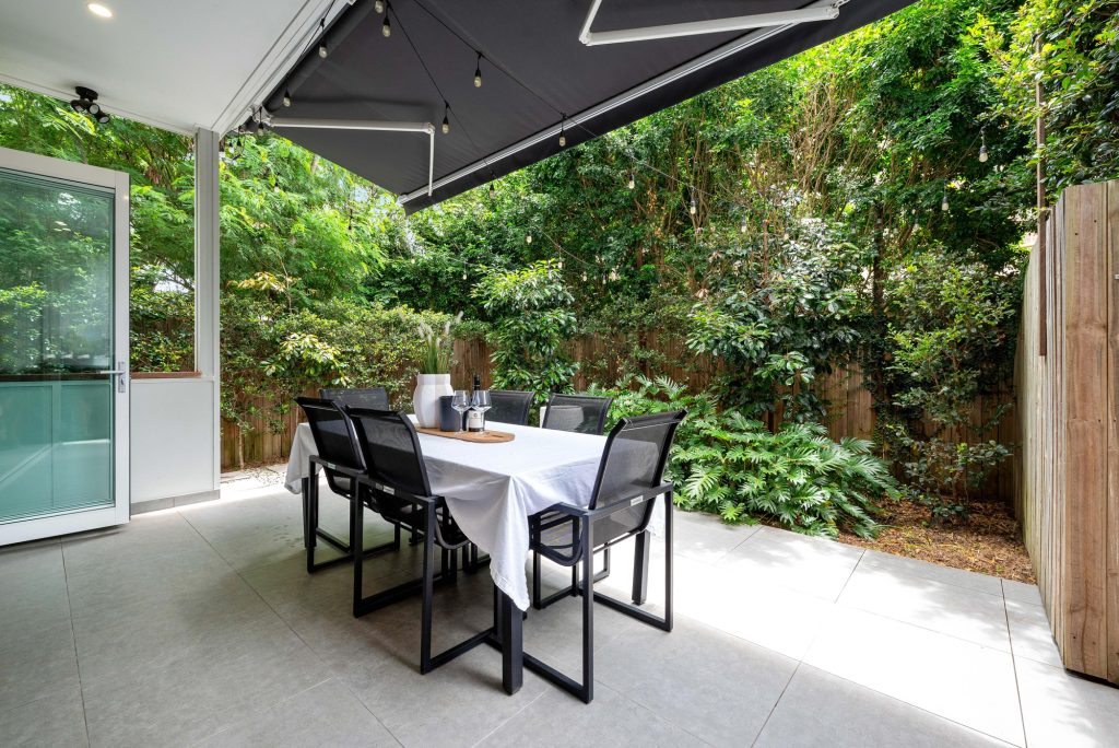 Set to a spectacular North-rear aspect, it’s perched at the end of its row and shares only one wall, with lovely high ceilings and banks of louvers providing an uplifting sense of light and space throughout. Spread over three levels, it showcases a generous dedication to living and serves up a beautifully relaxed entertainer with bi-fold doors opening up to a lush leafy courtyard with remote retractable awning, and an impressive kitchen featuring Smeg induction cooking, stone waterfall benches, and smartly integrated dining seating.